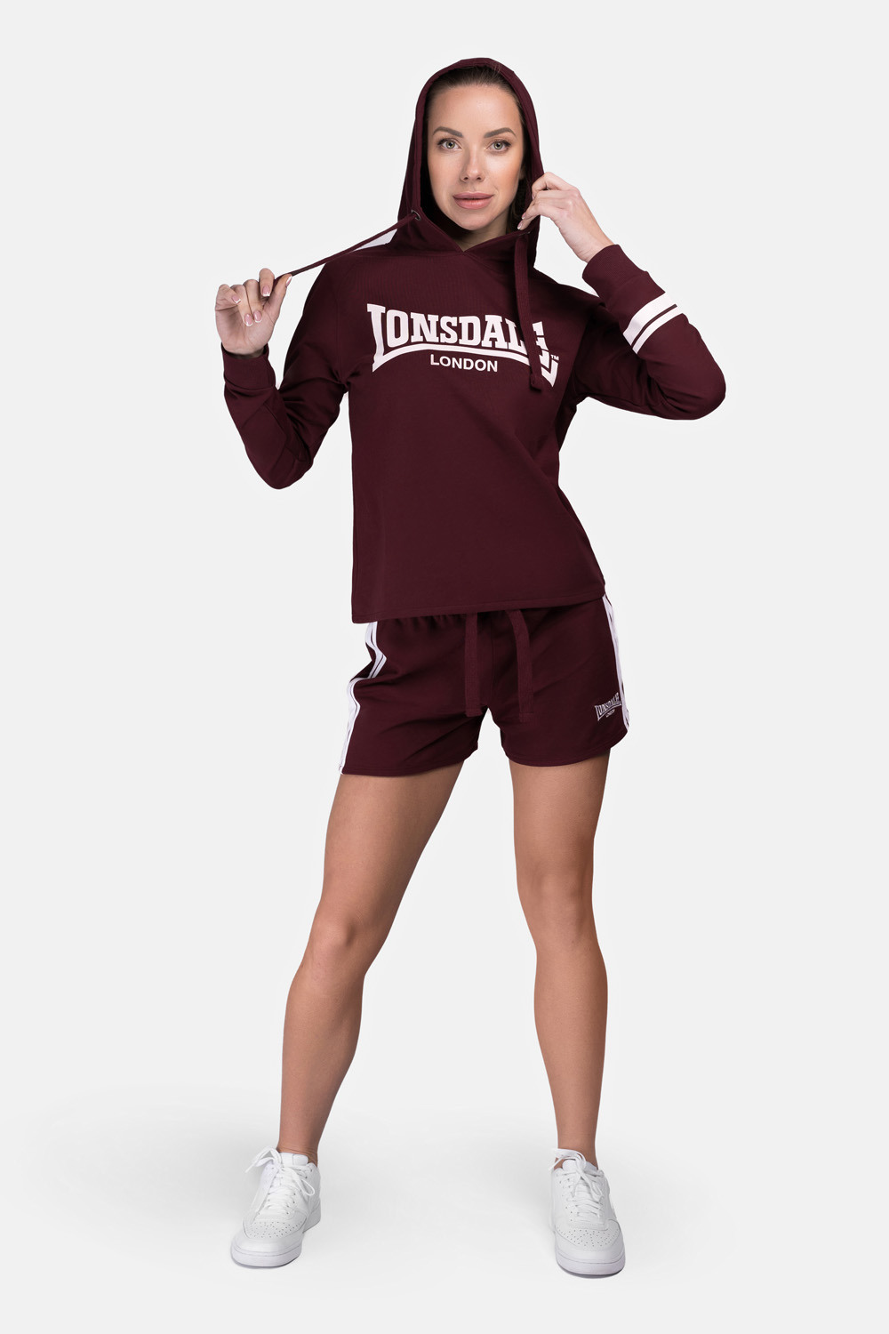 Sweat-shirt à capuche avec grand logo imprimé sur la poitrine et rayures imprimées sur la manche gauche. Il y a des poignets côtelés sur les manches raglan.