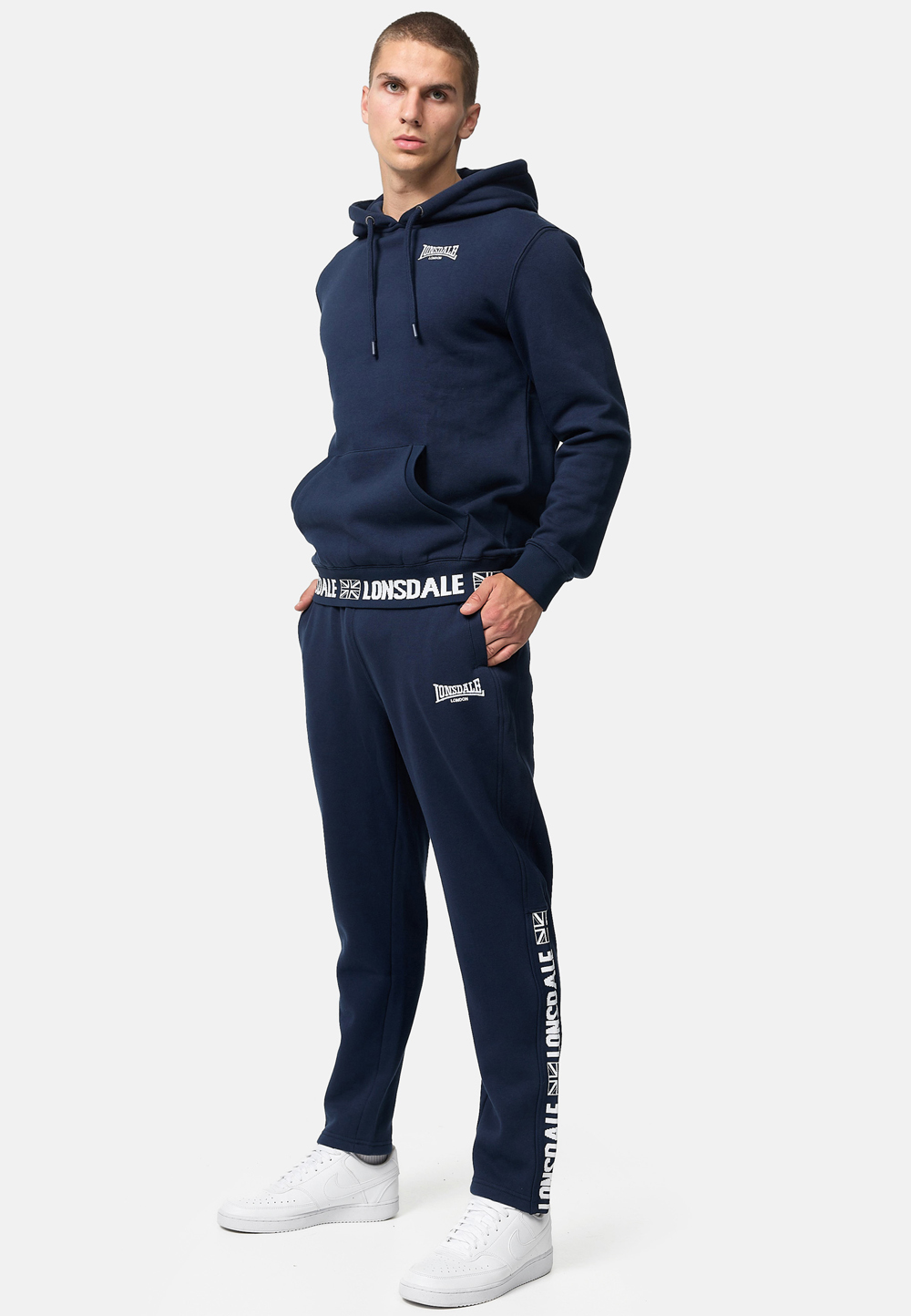 régulière - Description du modèle : Pantalon de survêtement avec logo brodé contrastant sur la cuisse gauche. Au niveau des hanches, il y a une manchette en jacquard avec le lettrage Lonsdale et l’Union Jack. Les cordons de serrage internes permettent d’ajuster encore plus le poignet élastique. Les coutures latérales sont légèrement avancées pour amener les côtes jacquard dans la jambe du pantalon et attirer l’attention. Sur le devant, il y a deux poches passepoilées et à l’arrière, il y a une autre poche dans le même look.